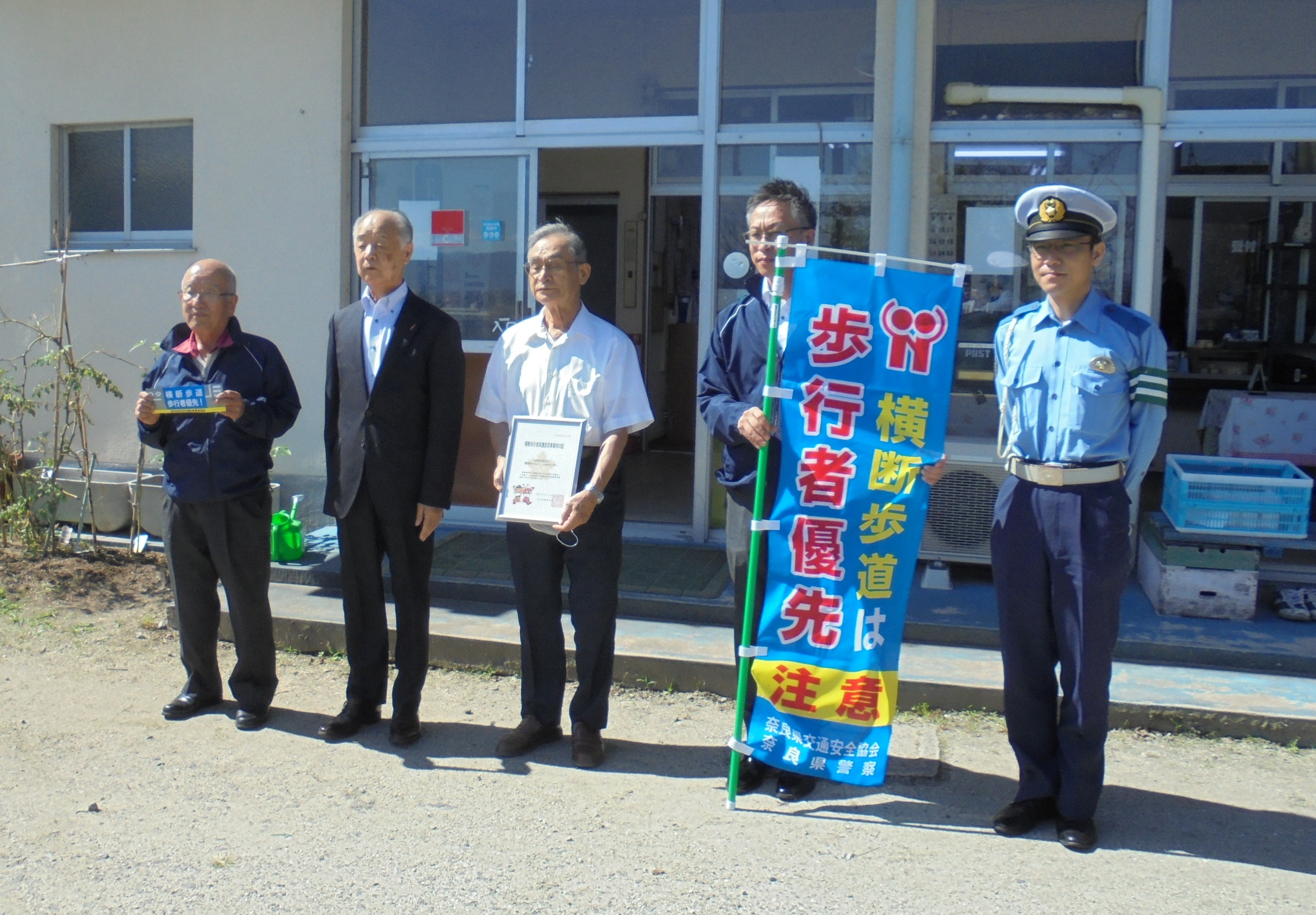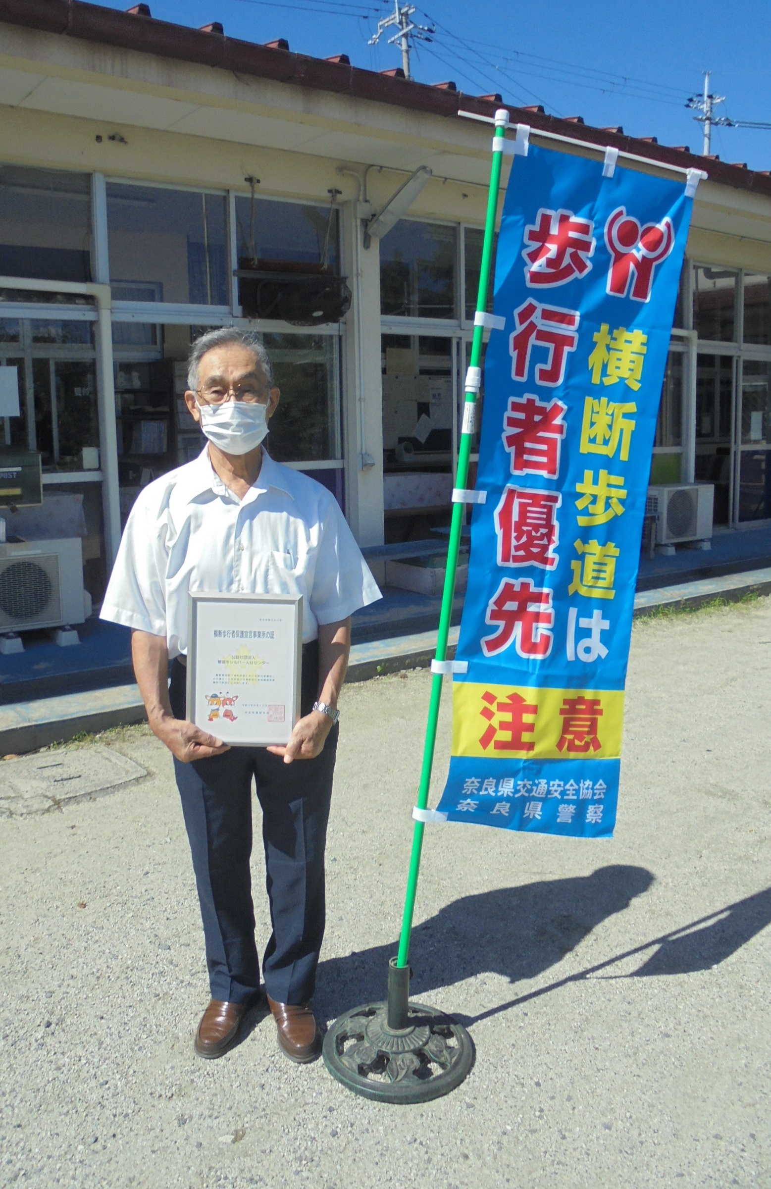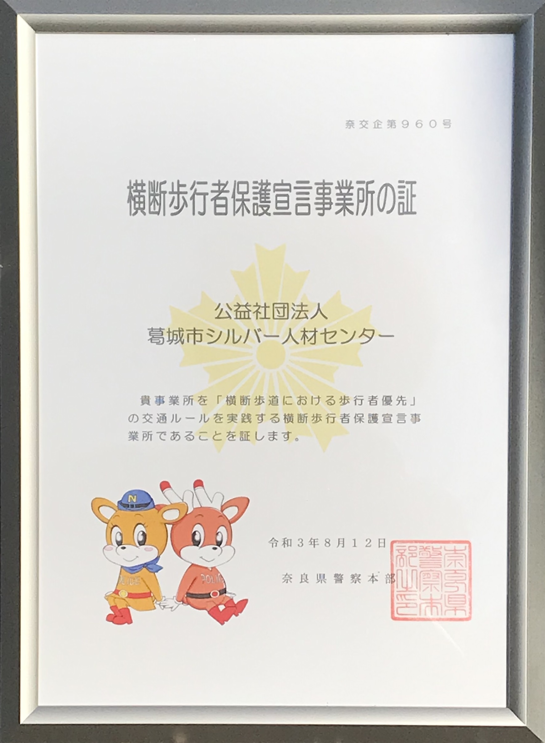 2021.9.27 : 奈良県警察本部から「横断歩行者保護宣言事業所の証(あかし)」の交付を受けました。 当センターでは「横断歩行者保護宣言事業所」の趣旨に賛同し、横断歩行者の安全確保に取り組む事業所として、令和3年7月29日「横断歩行者保護宣言」を行いました。 「横断歩行者保護宣言事業所」とは、県内の事業所で、全社員が横断歩行者の安全確保に取り組む事業所として、内外に「横断歩行者保護宣言」を行い、横断歩行者の安全確保に向けた行動を実践する事業所をいいます。 本日、高田地区安全運転管理者協会の吉川会長、木谷副会長、奥野副会長、そして高田警察署の笹本交通課長が当センターに来られ、「横断歩行者保護宣言事業所の証(あかし)」が池田理事長に手渡されました。 宣言事業所の一員である会員及び職員は、車を運転するときは横断歩道における歩行者優先について認識し横断歩行者を保護し、歩行するときは道路横断時のルールをしっかりと守り、それぞれを実践することにより、交通事故を一件でも多く減らすことができるよう努めていきます。 〜交通事故のない やすらぎの 大和路づくり〜 を目指します! |